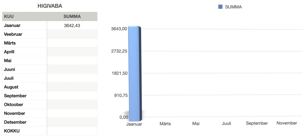 Higivaba tuli jaanuari jooksul kokku 3 642.43€. See peab iga kuu min. 3 500€ olema ehk siis see on üks tala neist neljast, mis kokku peab 14k tegema.